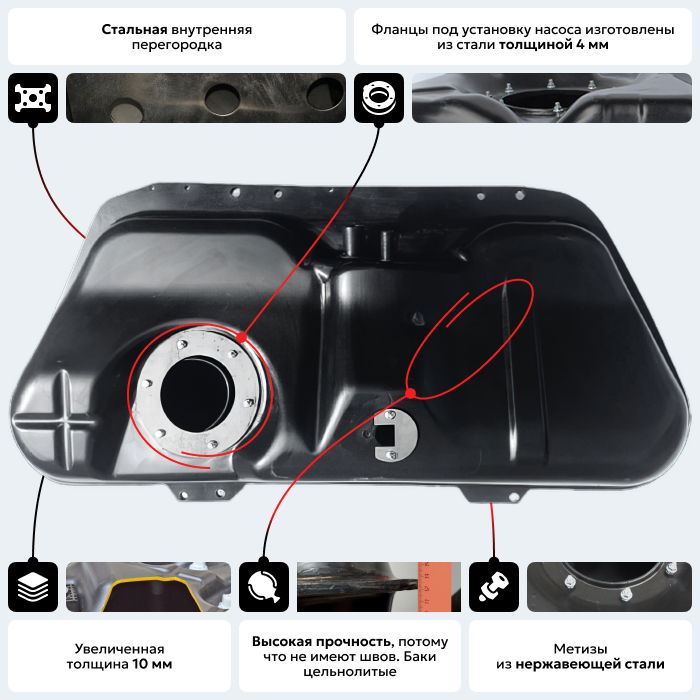 Бак повторяет геометрию оригинального бака и имеет те же габаритные размеры, крепежные и посадочные места. Фланец погружного модуля изготовлен из стали толщиной 4 мм со шпильками крепления погружного модуля М5х25 мм.