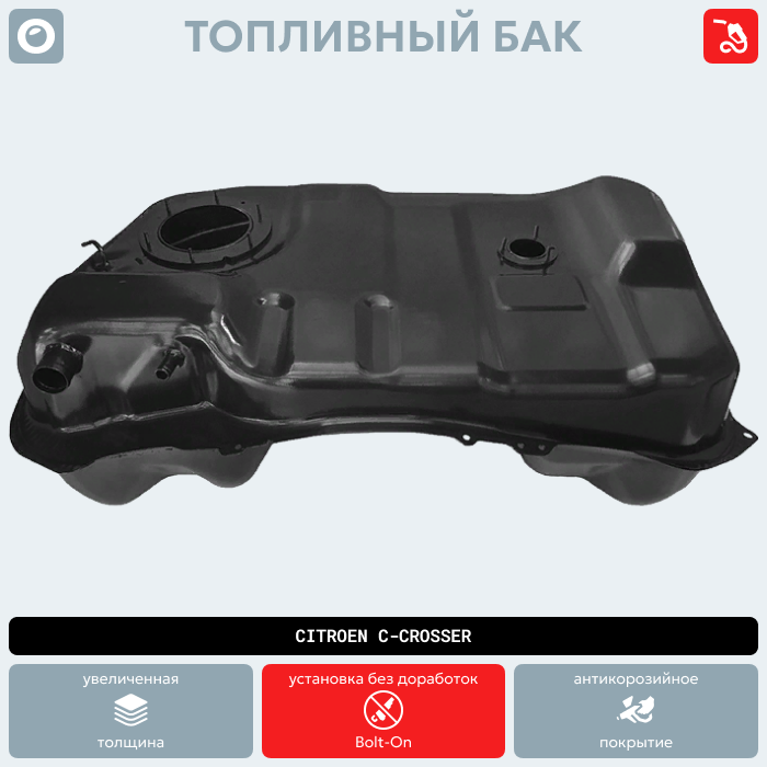 Бак Ситроен С-кроссер полностью соответствует оригинальному заводскому - форма и габариты, расположение технологических отверстий и пазов креплений. Бензобак имеет выштамповку оригинала и имеет идентичную вместимость топлива! Топливозаборник устанавливается штатный, под 6 болтов. В комплекте вместе с баком идут резиновые-бензостойкие прколадки, под датчик и заборник.
