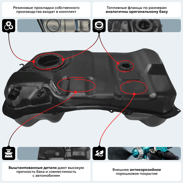 Одно из самых важных качеств бензобака на а/м Ситроен С-кроссер— это то что они устойчивы к коррозии. На производстве сначала применяется процесс обезжиривания поверхности, затем железофосфатное покрытие и, наконец, электростатическое порошковое покрытие, в результате образовывается антикоррозийное покрытие, которое сбережет топливную систему вашего автомобиля. Бак на а/м Citroen имеет улучшенные характеристики в сравнении с аналогичными баками из Китая и баками которые присутствуют на рынке России. Оставляйте заявку звонка — отправим фото наших баков в разрезе и фото баков китайского производства!