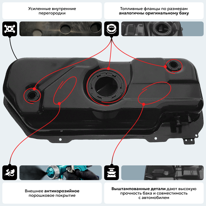 Одно из самых важных качеств бензобака на а/м Дэу Калос— это то что они устойчивы к коррозии. На производстве сначала применяется процесс обезжиривания поверхности, затем железофосфатное покрытие и, наконец, электростатическое порошковое покрытие, в результате образовывается антикоррозийное покрытие, которое сбережет топливную систему вашего автомобиля. Бак на а/м Daewoo имеет улучшенные характеристики в сравнении с аналогичными баками из Китая и баками которые присутствуют на рынке России. Оставляйте заявку звонка — отправим фото наших баков в разрезе и фото баков китайского производства!
