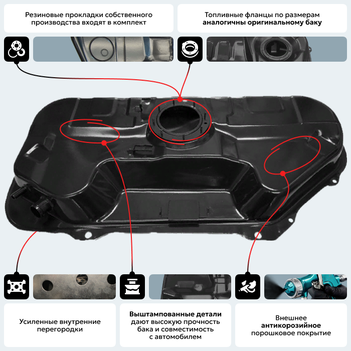 Одно из самых важных качеств бензобака на а/м Хендай Ай 20— это то что они устойчивы к коррозии. На производстве сначала применяется процесс обезжиривания поверхности, затем железофосфатное покрытие и, наконец, электростатическое порошковое покрытие, в результате образовывается антикоррозийное покрытие, которое сбережет топливную систему вашего автомобиля. Бак на а/м Hyundai имеет улучшенные характеристики в сравнении с аналогичными баками из Китая и баками которые присутствуют на рынке России. Оставляйте заявку звонка — отправим фото наших баков в разрезе и фото баков китайского производства!