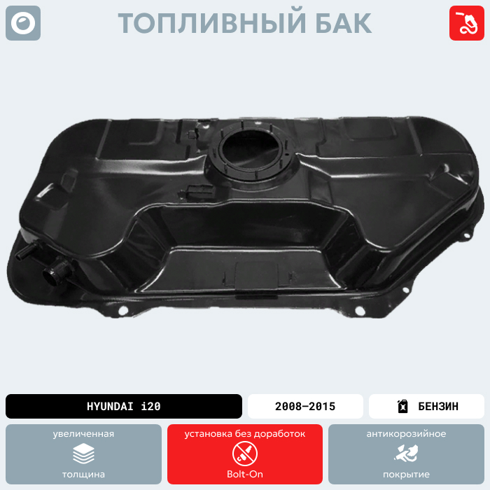 Бак Хендай / Хундай / Хендэ Ай / и 20полностью соответствует оригинальному заводскому - форма и габариты, расположение технологических отверстий и пазов креплений. Бензобак имеет выштамповку оригинала и имеет идентичную вместимость топлива! Топливозаборник устанавливается штатный, под 8 болтов. В комплекте вместе с баком идет резино-бензостойкая прокладка. Бак имеет перегородку для предотвращения гидроударов топлива.