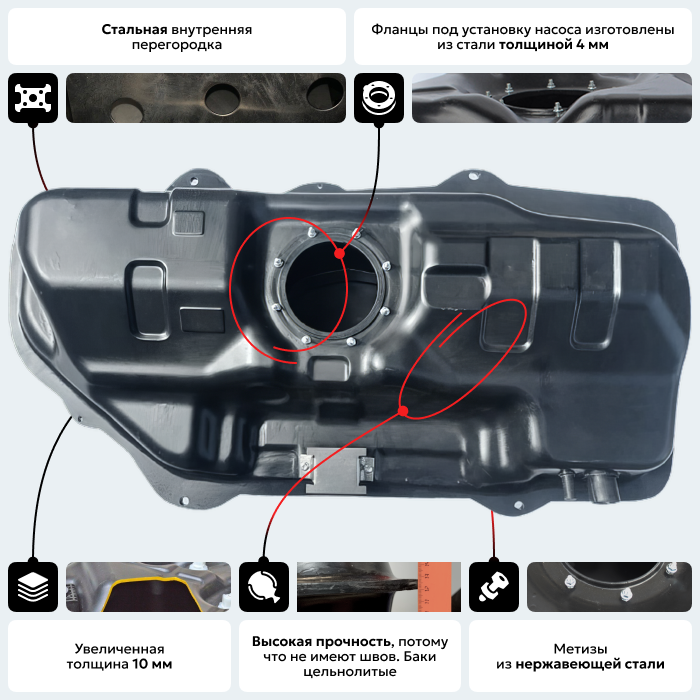 Бак повторяет геометрию оригинального бака и имеет те же габаритные размеры, крепежные и посадочные места. Фланец погружного модуля изготовлен из стали толщиной 4 мм со шпильками крепления погружного модуля М5х25 мм.