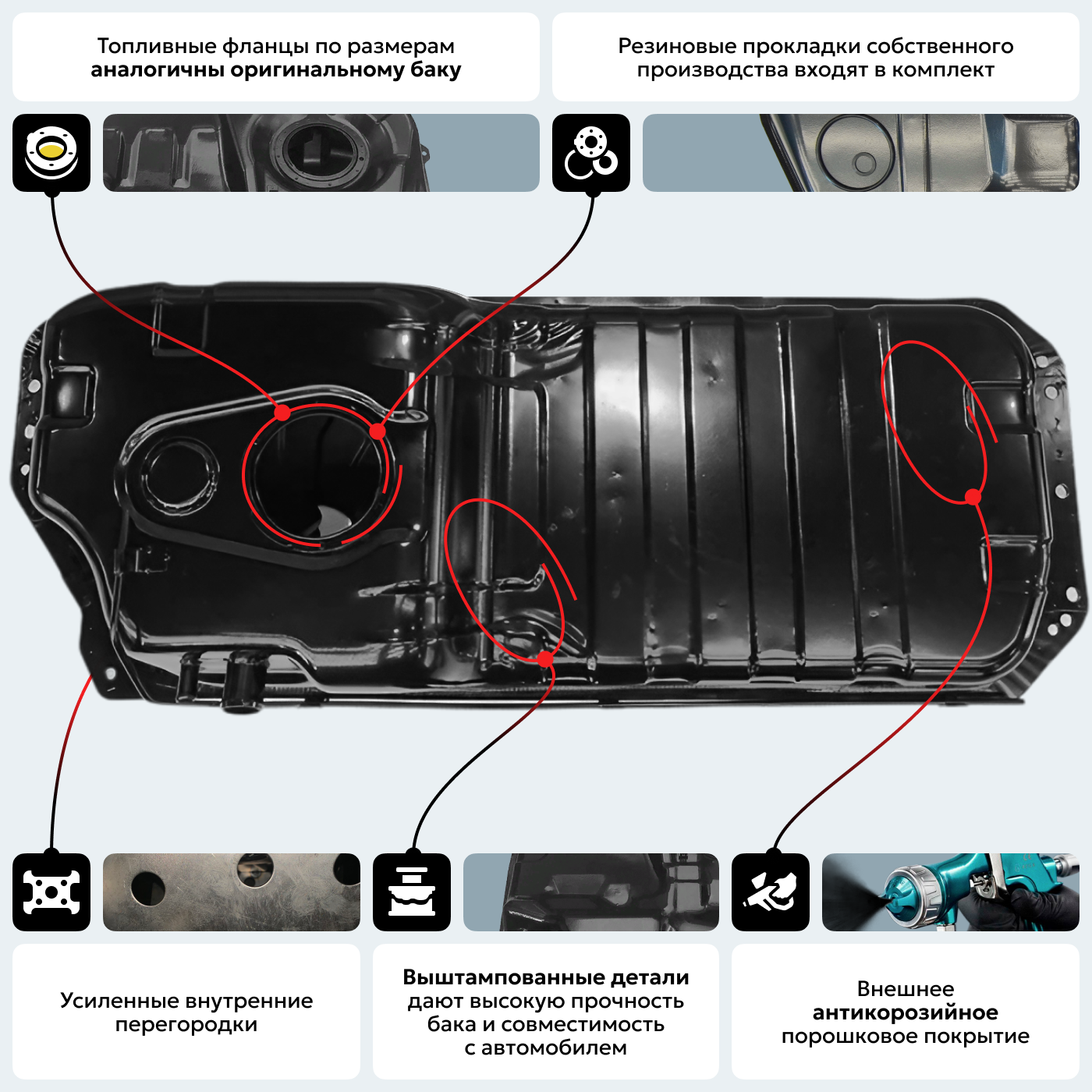 Бак Киа / Кия Соренто (2002-2009 г.в.) полностью соответствует оригинальному заводскому - форма и габариты, расположение технологических отверстий и пазов креплений. Бензобак имеет выштамповку оригинала и имеет идентичную вместимость топлива! Топливозаборник устанавливается штатный, под 6 болтов. Бак имеет 3 перегородки. В комплекте вместе с баком идет резино-бензостойкая прокладка и болты для установки оригинального погружного модуля.