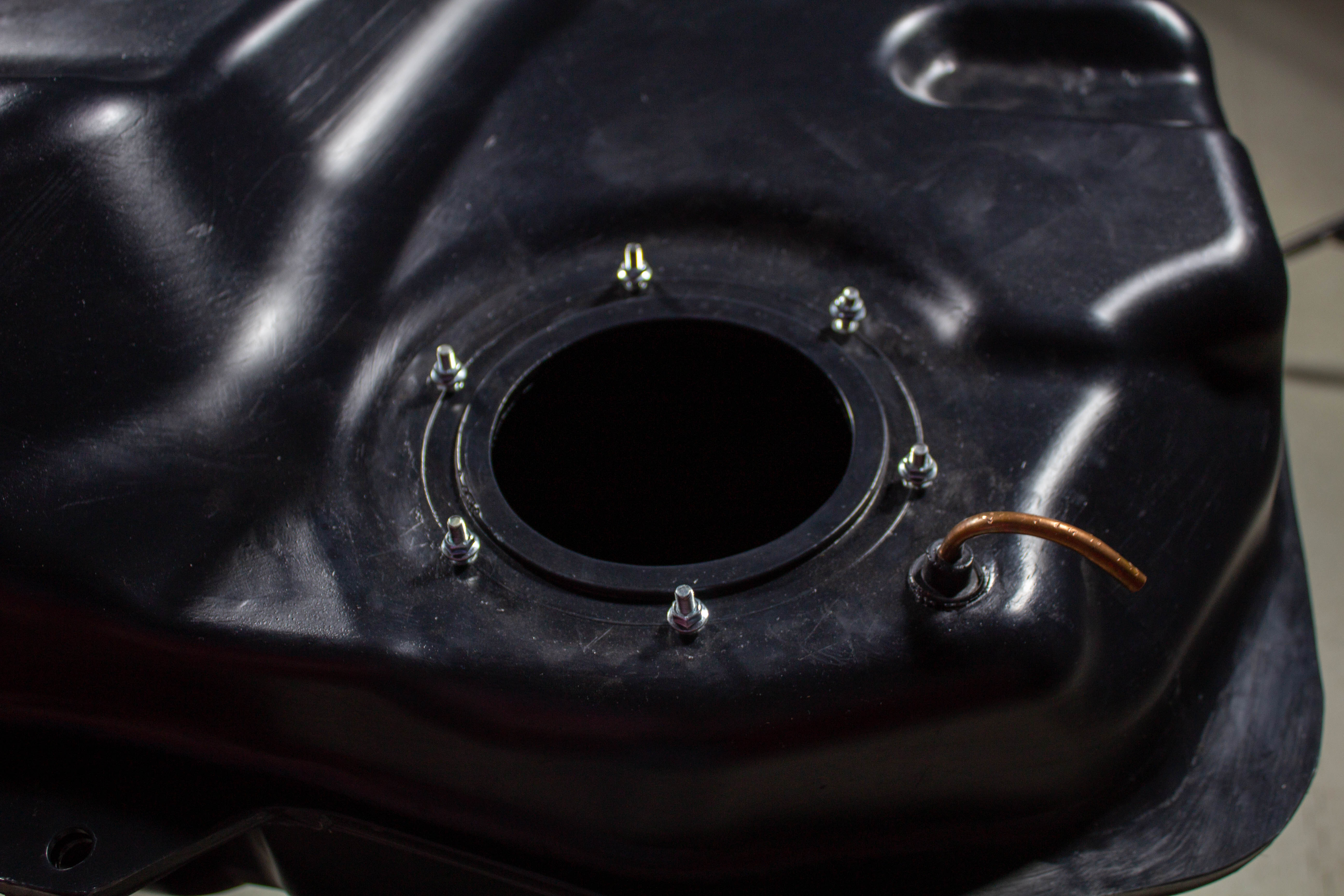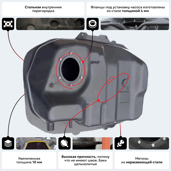 Бак повторяет геометрию оригинального бака и имеет те же габаритные размеры, крепежные и посадочные места. Фланец погружного модуля изготовлен из стали толщиной 4 мм со шпильками крепления погружного модуля М5х25 мм.