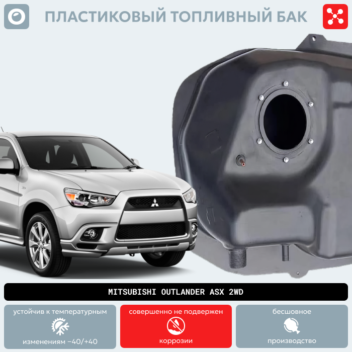 Одно из самых важных качеств пластикового бензобака на а/м Митсубиси Аутлендер Асх 2ВД— это то, что они устойчивы к появлению коррозии, царапин и сколов. Пластиковый бак никогда не заржавеет!