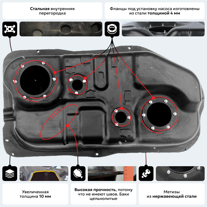 Бак повторяет геометрию оригинального бака и имеет те же габаритные размеры, крепежные и посадочные места. Фланец погружного модуля изготовлен из стали толщиной 4 мм со шпильками крепления погружного модуля М5х25 мм.