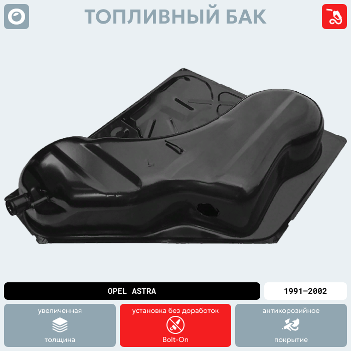 Одно из самых важных качеств бензобака на а/м Опель Астра Эстейт Ван— это то что они устойчивы к коррозии. На производстве сначала применяется процесс обезжиривания поверхности, затем железофосфатное покрытие и, наконец, электростатическое порошковое покрытие, в результате образовывается антикоррозийное покрытие, которое сбережет топливную систему вашего автомобиля. Бак на а/м Opel имеет улучшенные характеристики в сравнении с аналогичными баками из Китая и баками которые присутствуют на рынке России. Оставляйте заявку звонка — отправим фото наших баков в разрезе и фото баков китайского производства!