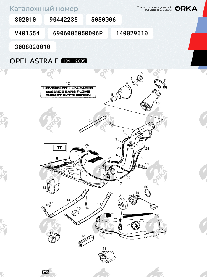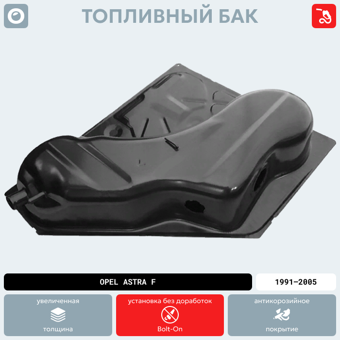 Бак Опель Астра Ф Классик полностью соответствует оригинальному заводскому - форма и габариты, расположение технологических отверстий и пазов креплений. Бензобак имеет выштамповку оригинала и имеет идентичную вместимость топлива! Топливозаборник устанавливается штатный, под 6 болтов, так же установлен противоотливной стакан под топливиозаборник. В комплекте вместе с баком идет резино-бензостойкая прокладка. Бак имеет перегородку для предотвращения гидроударов топлива.