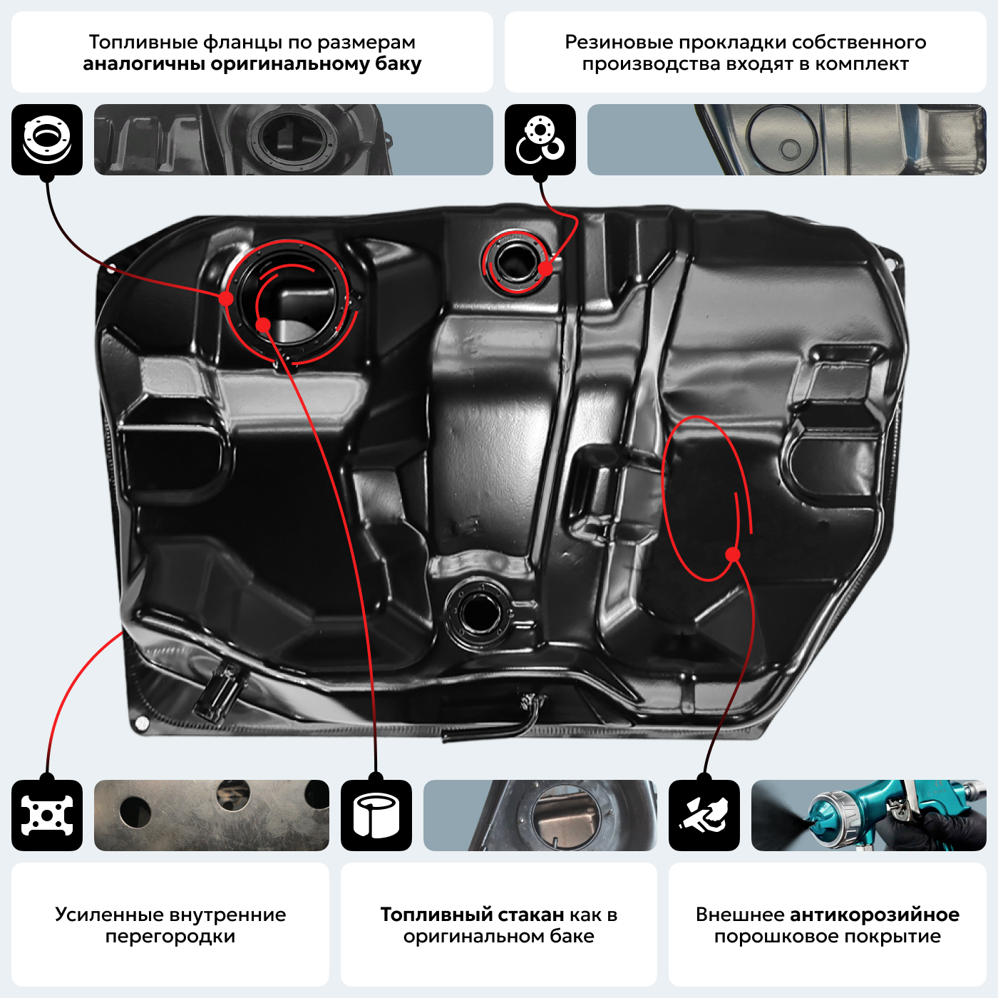 Одно из самых важных качеств бензобака на а/м Королла — это то, что они устойчивы к коррозии. На производстве сначала применяется процесс обезжиривания поверхности, затем железофосфатное покрытие и, наконец, электростатическое порошковое покрытие, в результате образовывается антикоррозийное покрытие, которое сбережет топливную систему вашего автомобиля. Бак на а/м Toyota имеет улучшенные характеристики в сравнении с аналогичными баками из Китая и баками, которые присутствуют на рынке России. Оставляйте заявку звонка — отправим фото наших баков в разрезе и фото баков китайского производства!